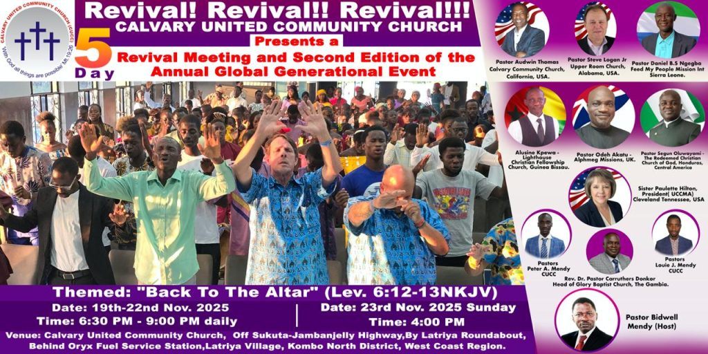 Calvary United Community Church, The Gambia, joyfully invites you, your family, and friends to a life-transforming 5-Day Revival under the theme: “Back to the Altar.” This sacred gathering is a divine call to return to the place of prayer, renewal, and deeper fellowship with God.